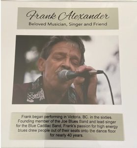 Poster: Frank Alexander. Beloved musician, singer, and friend. Frank began performing in Victoria, BC in the sixties. “Founding member of the Joe Blues Band and lead singer for the Blue Cadillac Band, Frank’s passion for high energy blues drew people out of their seats and onto the dance floor for nearly 40 years.”